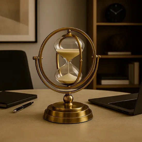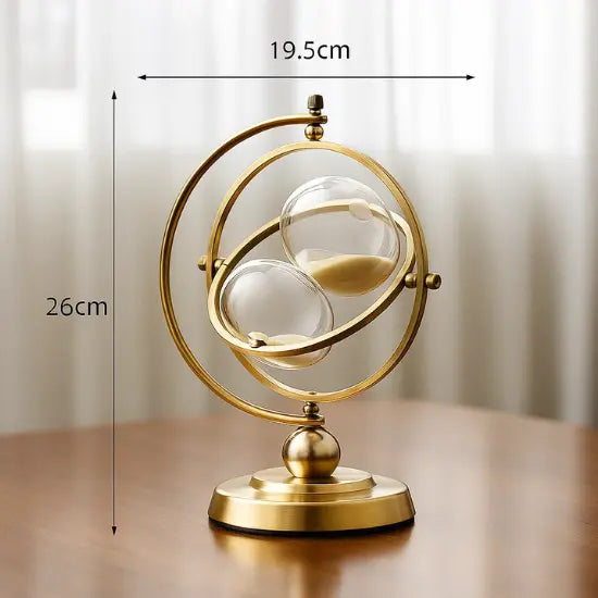 Gefertigt aus hochfestem Glas mit einer robusten Metallstruktur im edlen Kupfer-Antik-Finish, fügt sie sich harmonisch in klassische, moderne oder minimalistische Einrichtungsstile ein. Die innovative 720° drehbare Basis lädt zur Interaktion ein, wodurch die Sanduhr nicht nur dekorativ, sondern auch inspirierend und entspannend wirkt.